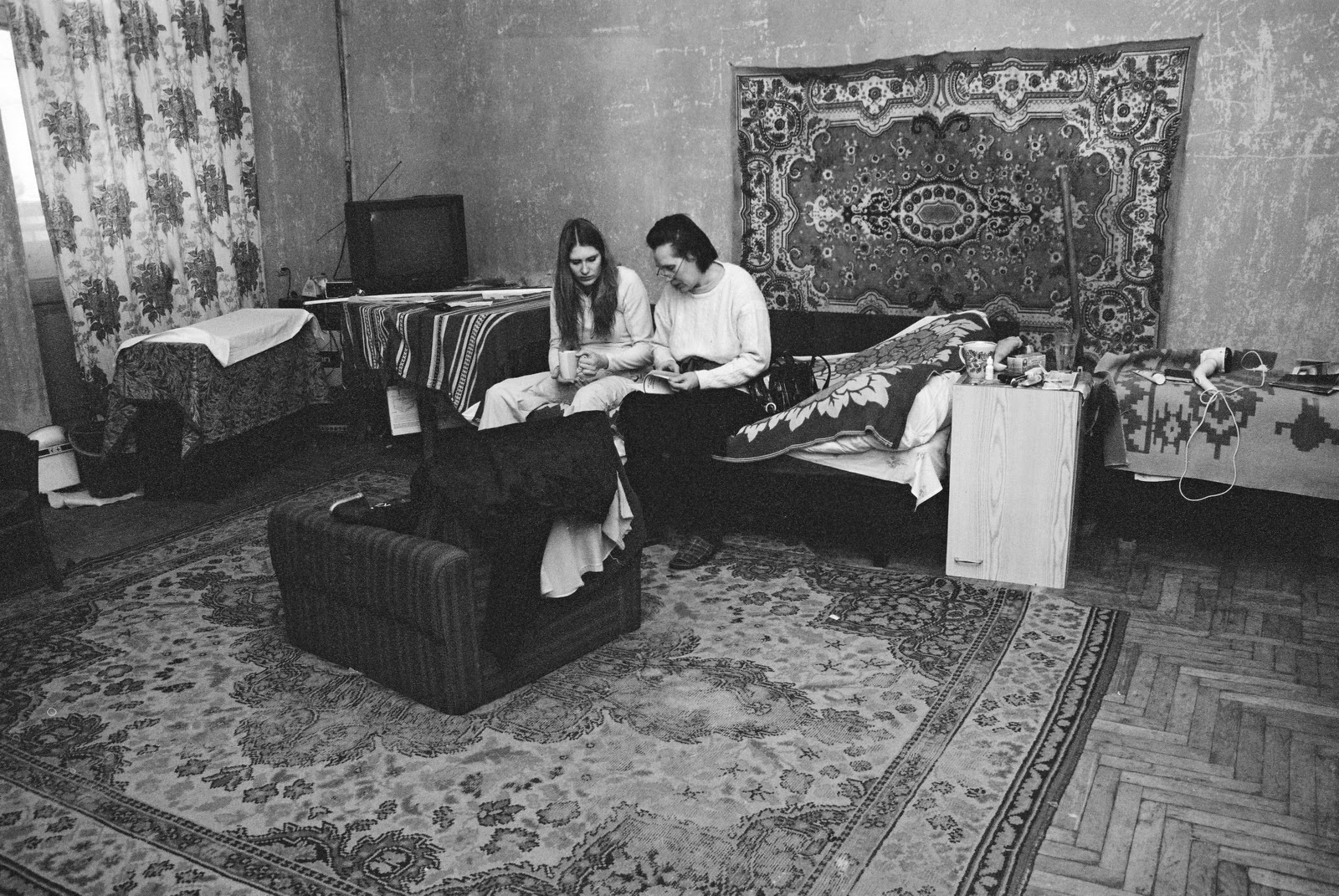 Героини этого снимка – Ирина и Светлана, мать и дочь, занимающие несколько холодных комнат опустевшей за последние годы коммунальной квартиры. В их просторных комнатах у меня всегда возникало ощущение легкости, вторгающейся в полуразрушенные пространства дома. Гостей у них, как и у остальных жителей, практически не бывает, но не из-за подавляющего чувства стыда «за условия хуже, чем у зверей», по словам одной из жительниц, а из-за постоянной нехватки времени.