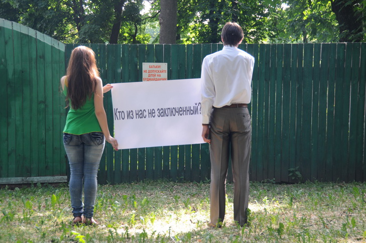 Отдыхающим в выходные дни в центре Киева было предложено поучаствовать в минутной импровизированной акции протеста, фиксируемой фото и видеокамерами. Акция происходила перед судебными заседаниями, решающими судьбы двух незаконно лишенных свободы общественных активистов и художников Дмитрия Солопова и Александра Володарского.